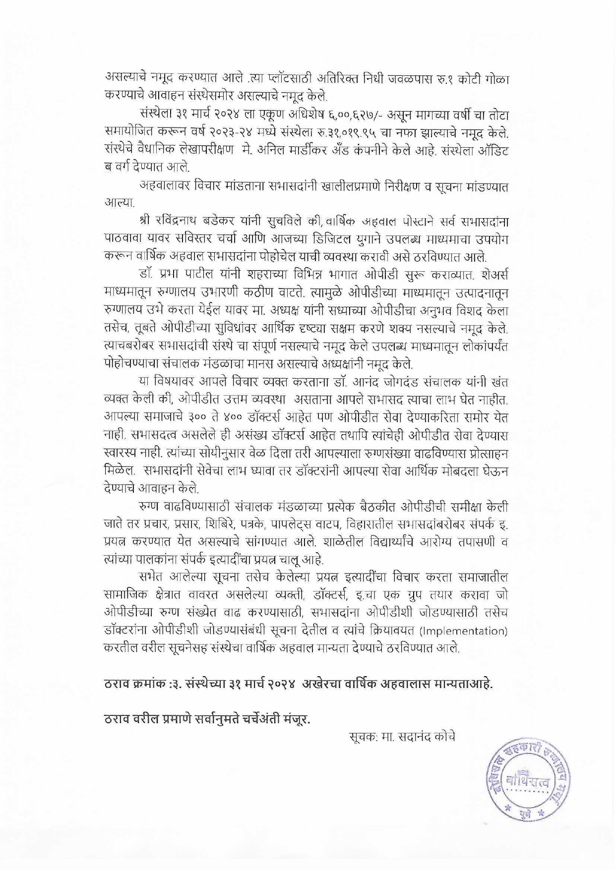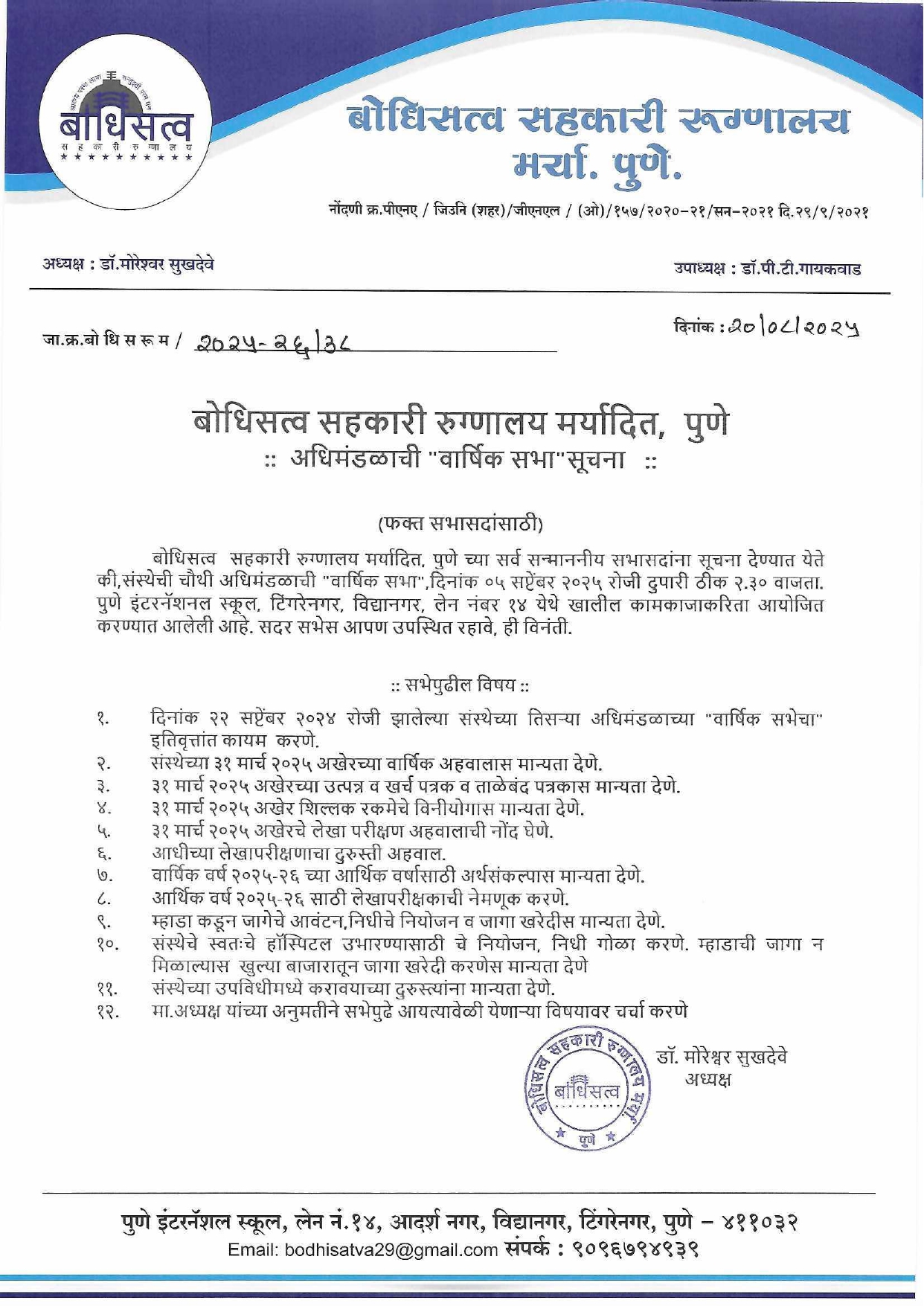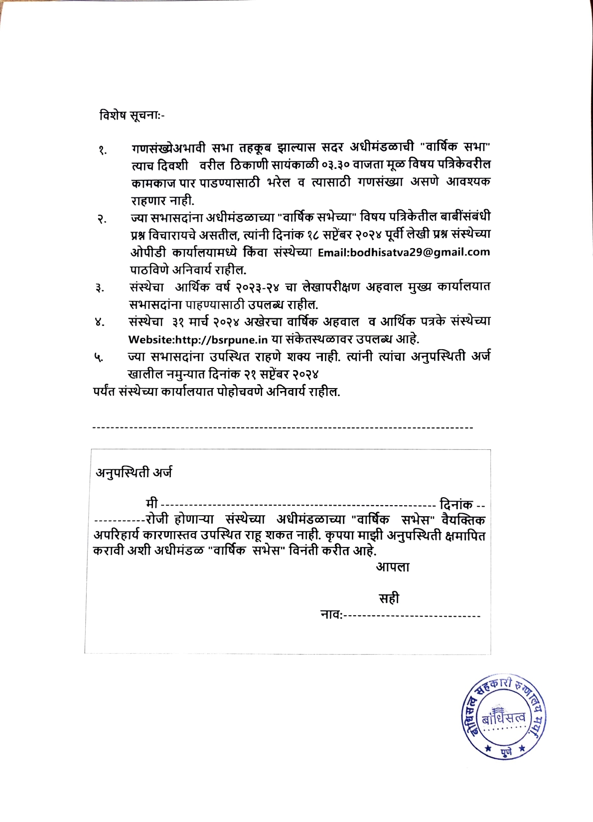 सर्व सन्माननिय सभासद, बंधू ,भगिणी यांना सुचित करणेत येते की , आपल्या संस्थेच्या अधीमंडळाची "चौथी वार्षिक सर्वसाधारण सभा "