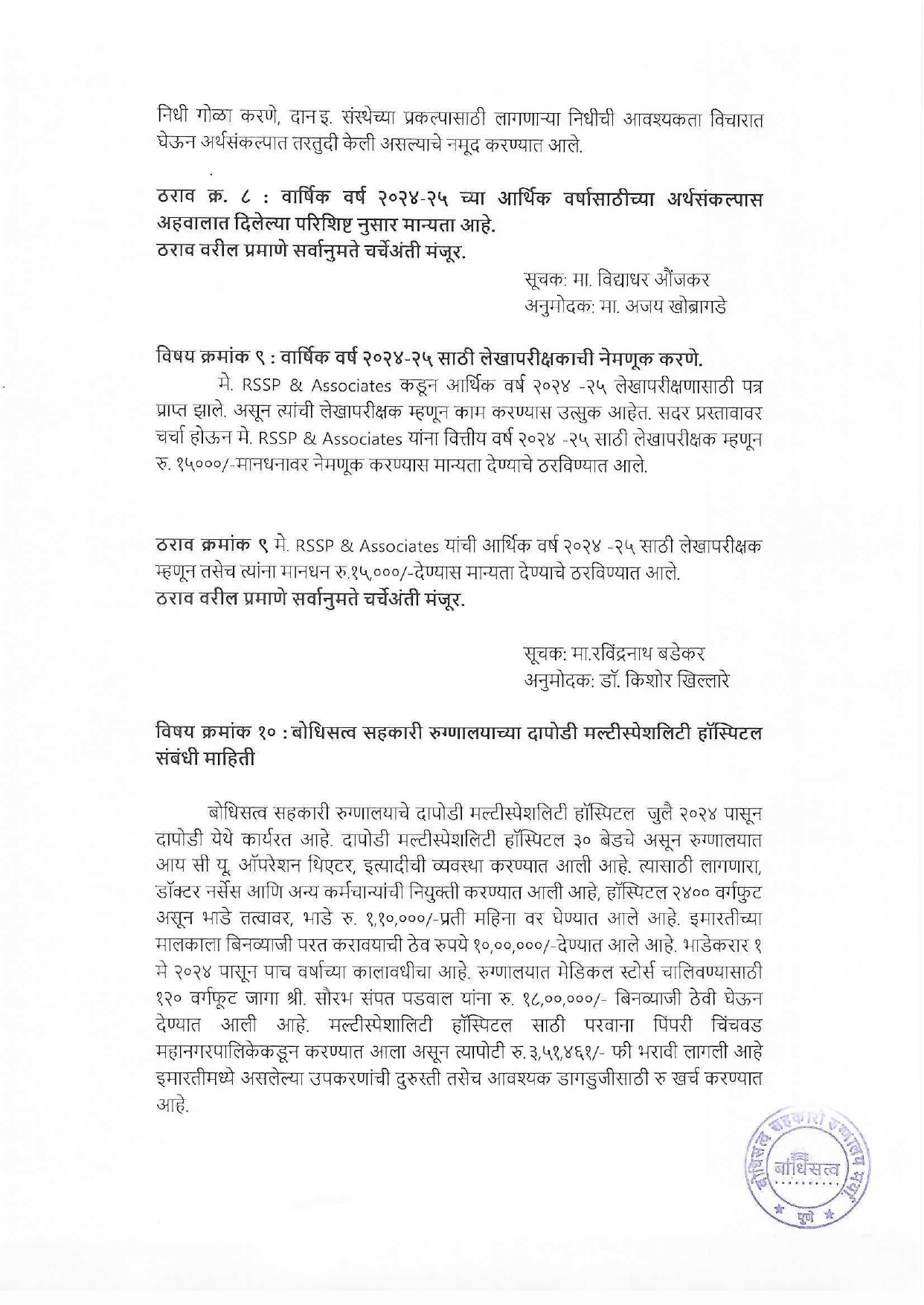 As per the Bye-laws of Bodhisatva Sahakari Rugnalaya, the management and superrindence of the Hospital vest with the Board of Directors consisting of 15 members comprising of the Doctors from medical field, management experts, and members from various fields. The existing Board of Directors of the Bodhisatva Sahakari Rugnalaya Maryadit is as under: