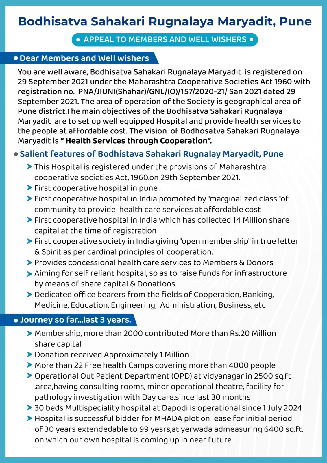The Bodhisatva Sahakari Rugnalaya Maryadit is registered on 29 September 2021 under the Maharashtra Cooperative Societies Act 1960 with registration no. PNA/JIUNI(Shahar)/GNL/(O)/157/2020-21/San 2021 dated 29 September 2021. The area of operation of the Society will be Pune district initially, to be expanded in all the districts of Maharashtra gradually. Hospital has started its functioning from 15 December 2021, initially with OPD in the premises of Pune International School Vidyanagar Pune. The Bodhistava sahakari Rugnalaya was inaugurated by the Commissioner & Registrar of Cooperative Societies, Government of Maharashtra on 14 October 2021. The Hospital started its services to the public from 1 December 2021.