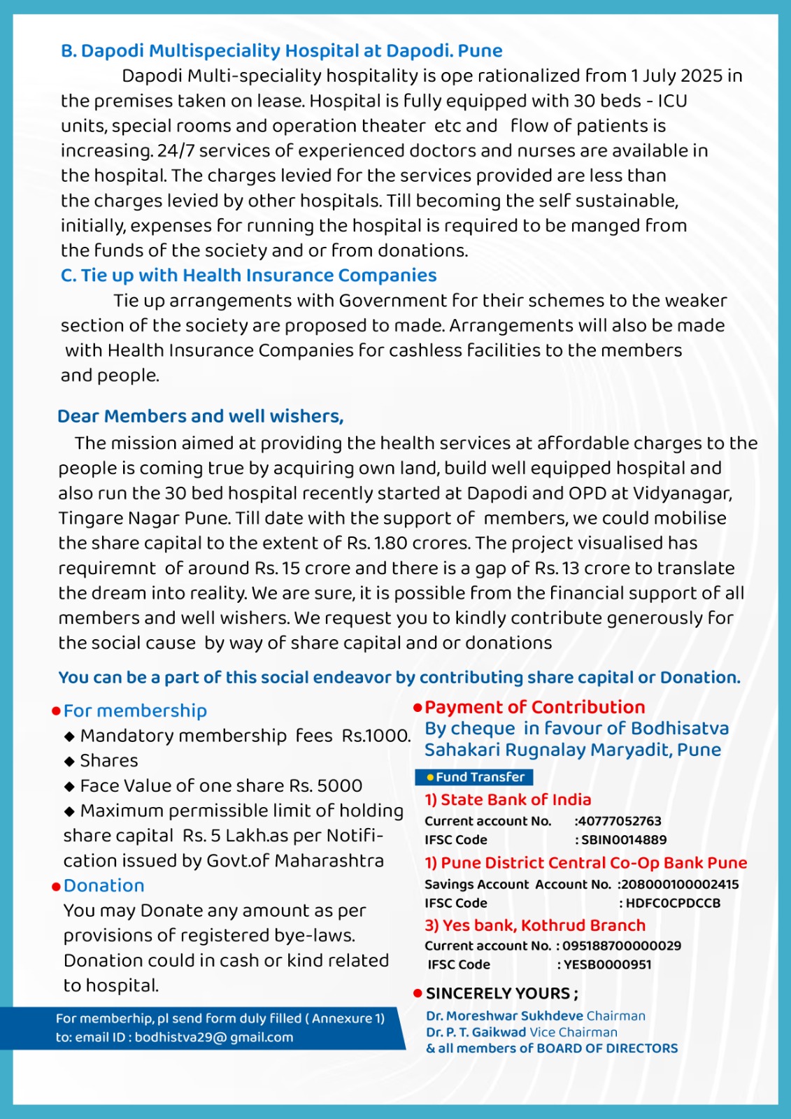 The Mission of the Bodhisatva Sahakari Rugnalaya is provide quality health services to vulnerable group at affordable cost and save from the exorbitant cost being charged by the private hospitals.The aim of the Bodhisatva sahkari Rugnalaya Maryadit has been to set up 300 to 400 bed Hospital with attached Medical College and paramedical related courses affiliated to it over a period of ten years. To start with, OPD will be set up at various places in Pune.To start with, OPD will be set up at various places in Pune. The structure envisaged and plan for expansion will be as under:
